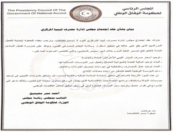 2020/12/07 بيان بشأن عقد اجتماع مجلس إدارة مصرف ليبيا المركزي