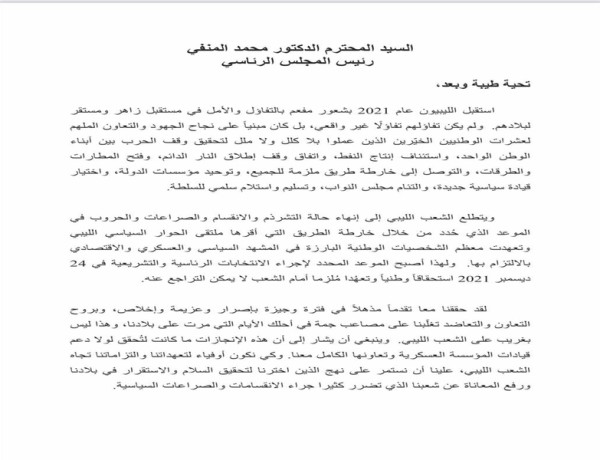 2021/08/30 رسالة إلى السيد المحترم الدكتور محمد المنفي رئيس المجلس الرئاسي