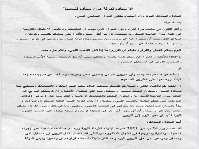 2021/06/24 رسالة مفتوحة إلى أعضاء ملتقى الحوار الليبي.  ...