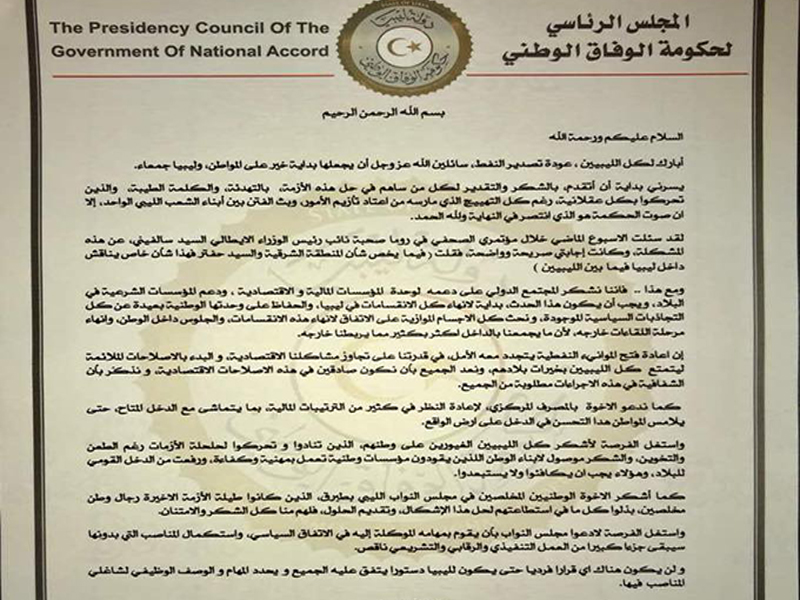 أن فرصة تحقيق السلام والأمان، والرخاء، في ربوع بلادنا ممكنة، ومواتية، إذا اتحدنا شباباً وكهولاً، نساءً ورجال .. فليبيا بلد شبابي يتميز بأن ما نسبته 75%  من مواطنيه في سن الشباب، ودون سن الثلاثين، وهم قوة منتجة، ومبدعة، وخلاقة، ويستطيعون إذا ما توفر لهم المناخ المناسب خوض غمار التنمية الشاملة وقيادة البلاد إلى مستقر لها، ينعم فيه مواطنوها بالأمن والاستقرار، والطمأنينة، والرخاء، والعدالة، والمساواة .. لذا فنحن بحاجة إلى حكومة توافق تحقق هذه الخيارات الاستراتيجية، وتواجه تلكم التحديات التي كادت أن تعصف بنا وببلادنا وبمستقبلنا .. وليس الأمر هيناً .. لكن عزيمة الرجال المخلصين تصنع المستحيل، وتحقق الطموحات الكبيرة لليبيين جميعاً دون استثناء أو إقصاء.